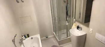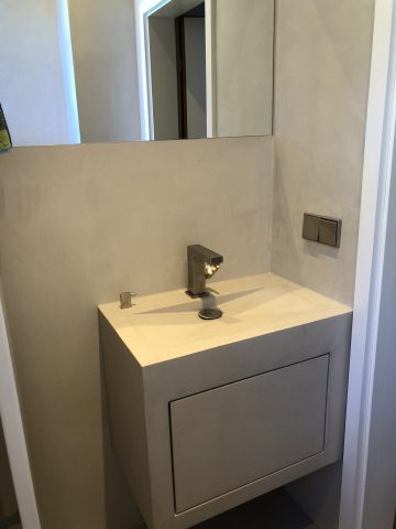 Privatwohnung in Wüstenbrand. Das Bad war vorher mit weißen Fliesen gefliest. Jetzt ist es mit fugenloser Spachteltechnik beschichtet worden Boden und Wände im selben Farbton.