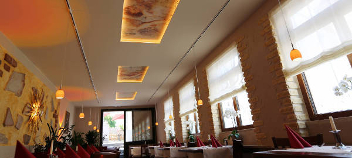 Restaurant „Rossini“ in Schwandorf. Auch hier wurden eigens auf die Deckenaussparungen die Glamora Tapeten hergestellt und indirekt beleuchtet.