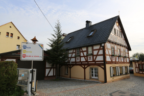 Referenz einer Fassadenarbeit in Oberlungwitz. Objekt der Stadtwerke Oberlungwitz. Anstrich mit Fassadenfarben von der Firma STO und einem Logo, welches nach Vorlage von uns ausgeplottet und angebracht wurde.
