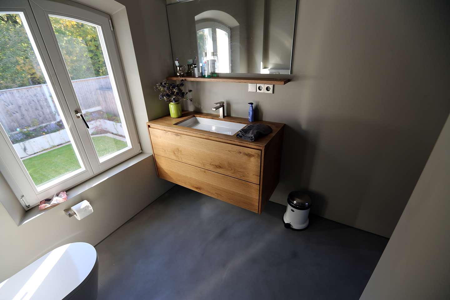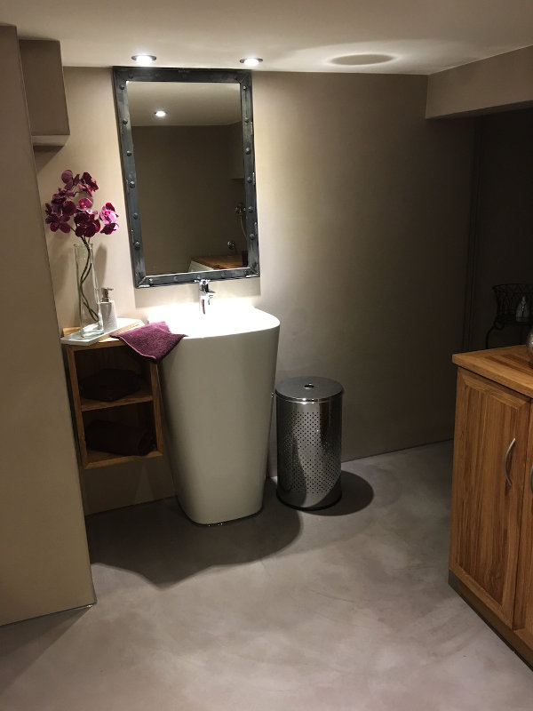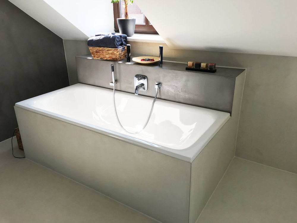 Fugenlose Bäder, Treppen und Nassbereiche allgemein lassen sich ebenfalls problemlos mit TopCiment beschichten, was eine spezielle und außergewöhnliche Gestaltung in Ihrem fugenlosen Bad / Raum ermöglicht. Grundsätzlich können nahezu alle Oberflächen mit diesem Material beschichtet werden. Bei Bädern bieten wir zum Beispiel die komplette Abdichtung, bis hin zum fertigen Bad an.